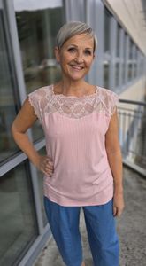 Myk og stretchy topp med ribbestruktur og fin blondedetalj over skuldre og utringning. Sitter pent på kroppen og er like fin alene som under skjorter og jakker.