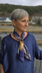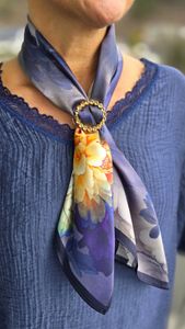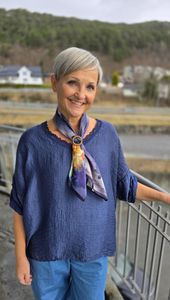Et elegant silkeskjerf i blå og grå toner med litt gult som gir antrekket et rolig og eksklusivt uttrykk.