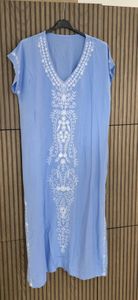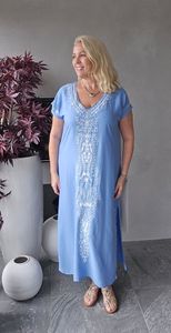 Marmaris Kaftan – Blue & White har et friskt og sommerlig uttrykk, med vakre broderte detaljer i hvitt mot en klar blå bunn. Kontrasten mellom fargene gir plagget et rent og elegant preg, inspirert av hav, sol og varme dager ved stranden.