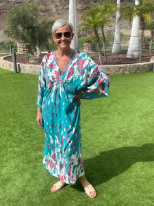 Nice Kaftan – Green & Rose har et friskt og balansert uttrykk, med en dyp grønn bunn kombinert med myke rosatoner og lyse detaljer. Fargene gir plagget liv og dybde, samtidig som helheten oppleves gjennomført og elegant.