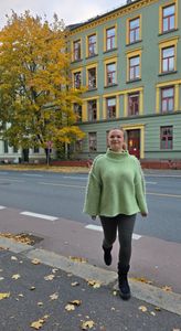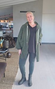 Synnøve bruker str. XL. Hun er ca. 114 cm over hofte/bak på det bredeste.