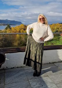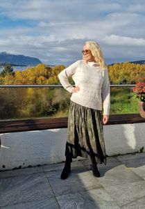 Synnøve har str. 42 i genseren, hun er 105 cm over bysten. De er store i størrelsen.