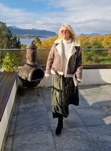 Synnøve viser jakken i str. 44, hun er ca. 105 cm over bysten