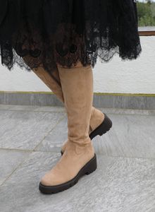 Høy boots med semsket stretch utseende stoff , glidelås på innsiden. Selve foten har for av kalveskinn.